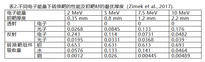 这一现象早在一百多年前就已被发现,被称为轫致辐射。该辐射的能量与穿透能力,与60Co源产生的γ辐射相近。遗憾的是,EB/X射线转换效率极低,其数值取决于靶材成分与电子束能量,仅能达到较低的百分比。不同靶材的X射线转换效率存在差异,钨或钽靶材的转换效率通常在7%–12%之间。理论预测与实际验证表明,靶材的原子序数与电子能量对转换过程的效率影响最为显著(见表2)??梢匀衔?,靶金属薄片的最佳厚度应约为电子在该材料中穿透深度的0.3–0.4倍。