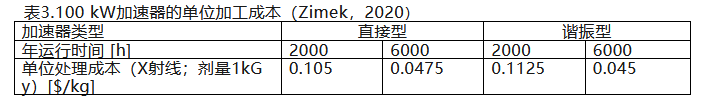 因此,在条件允许的情况下,使用电子加速器在经济上更具优势。低能直接式加速器成本更低、电能利用效率更高,这也会对加工经济性产生一定影响。多种辅助因素会显著改变加工的经济效益,所有这些因素及相关成本均会影响X射线加工的经济性以及辐射加工装置的单位运行成本。直接式(2.5MeV)和谐振式(5MeV、7.5MeV)加速器的平均束流输出功率均为100kW(见表3),但二者的电子能量和成本利润存在差异。